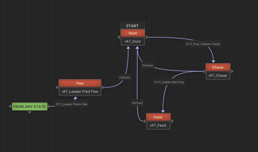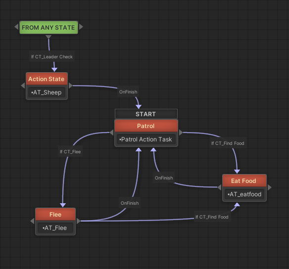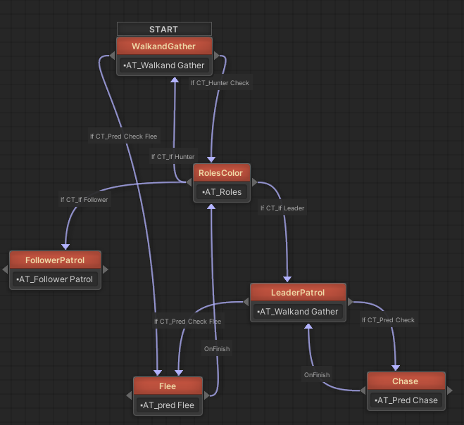 This is a solo project I made hoping to learn more about how to handle large quantities of different AI types. In this game, AI sheep (Teal if wild, White if tamed) graze in search for food pellets, Wolves (large, Red) will hunt the lone sheep, and Shepherds (Pink) will gather in groups to wrangle Sheep and chase away Wolves. If either the Sheep or the Wolves don’t eat, they will starve and despawn.