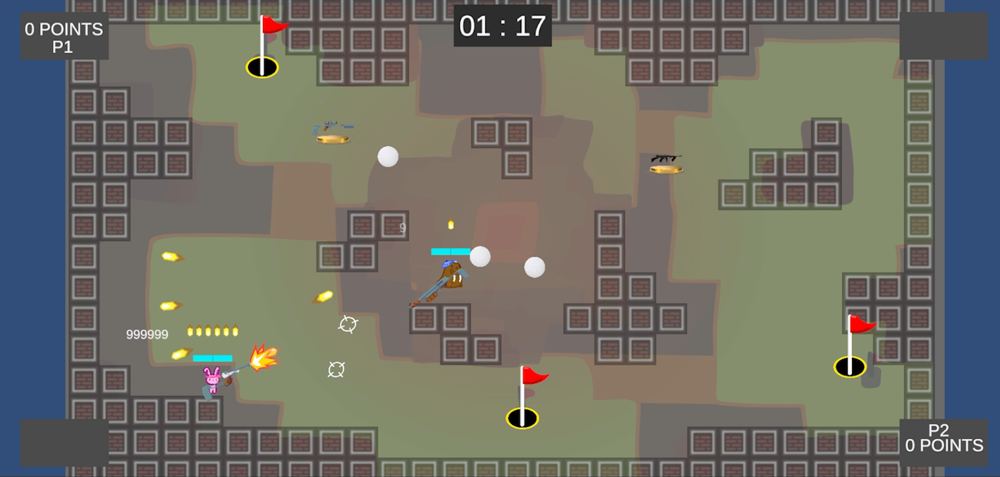 Fire in the Hole is a 2 - 4 player couch co-op twin stick shooter, where players must compete against each other in a Golf arena, competing to Golf the most golf balls while fighting each other off with different guns in intense top down combat. Players use whatever weapons, unique power ups, and wacky types of Golf balls like the Bomb Ball, Scatterball, Walking Ball and more to get an edge on their enemies.